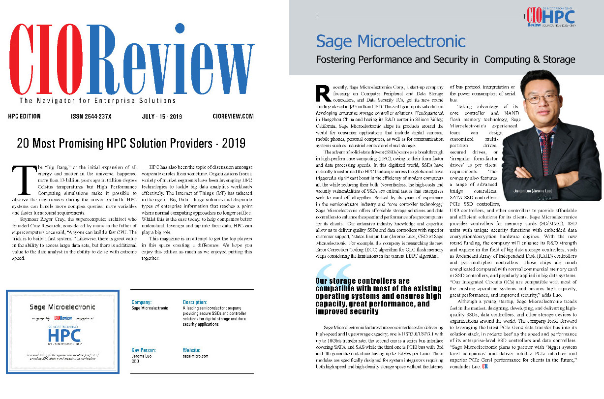 7月15日,美國(guó)媒體CIOREVIEW公布2019年20個(gè)最有潛力HPC解決方案供應(yīng)商名單,中國(guó)大陸企業(yè)華瀾微電子股份有限公司(Sage Microelectronic Corp)入選。這是繼2017年浪潮入選之后,中國(guó)大陸企業(yè)再一次登榜。